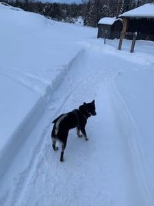 The dog Yuki went with us. She would leave periodically and dart off into the woods. I worried that she would get lost but my brother said she would return and not to worry. And she always did find us and when we were done trekking or cross country skiing and arrived at the house she got there almost the same time that we did or just a few minutes after. My sister and her husband always make Yuki wear a little harness/vest that has her information in it, her Rabies tag